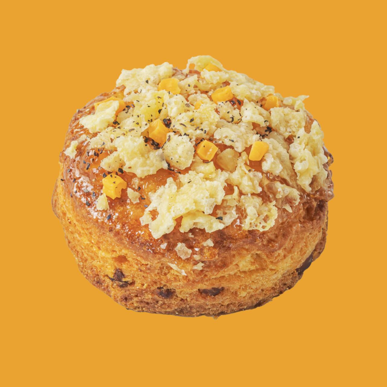 Honey Belle(ハニー・ベル)は、はちみつのまろやかな甘さとチェダーチーズの香ばしさが重なり合う、甘じょっぱい味わいが魅力のスコーンです。生地にはチーズとはちみつを練り込み、しっとりとコクのある生地に。さらに表面には角切りチーズとチーズチップをたっぷりのせて焼き上げ、こんがりとした焼き色と香ばしさを引き出しました。甘すぎず、塩気が強すぎることもなく、ふわりと広がるやさしい風味。
